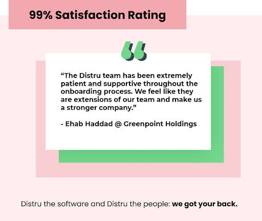 They say it takes a village, and it really does. Distru's customer support is backed by industry veterans and Distru power users. We don't outsource any of our support, ever. You'll always have someone who understands your needs and can help you out. Chances are they were in your position at some point dealing with the same issues! With fast response times and a 99% satisfaction rating, you'll have dedicated one-on-one support from our team to help answer any questions you may have.